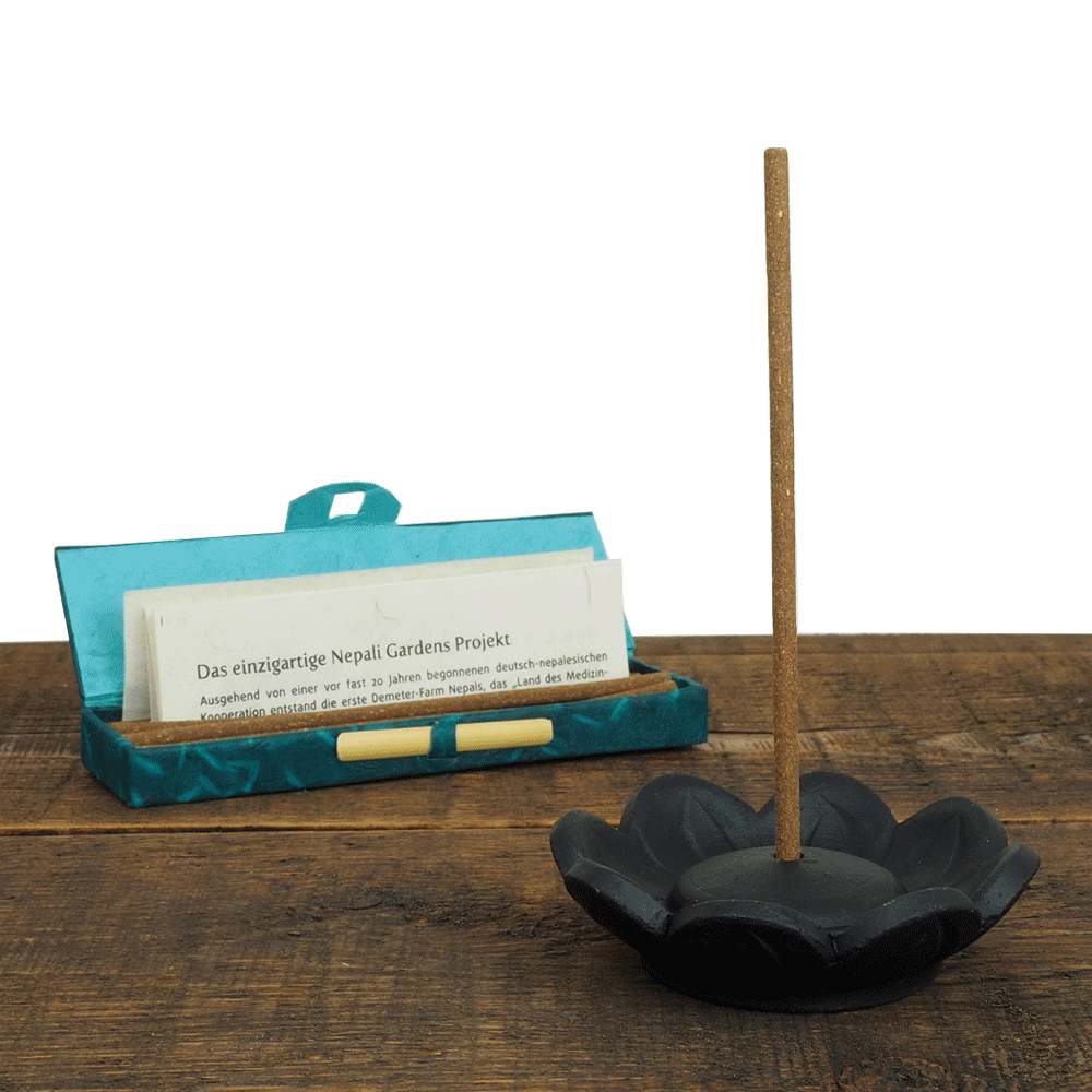Dieser schöne Räucherstäbchenhalter mit großem Loch in der Mitte bietet Halt für Räucherstäbchen in fast allen Größen und Durchmessern. So passen auch die Nepali-Gardens-Räucherstäbchen in die Öffnung, die selbst keinen dünnen Stiel oder anderen Kern haben, weil sie zu 100% aus handgeformtem Bio- und demeter-Räucherwerk bestehen. Das ganze Stäbchen brennt kann auf diese Weise abbrennen, kein Müll bleibt übrig.