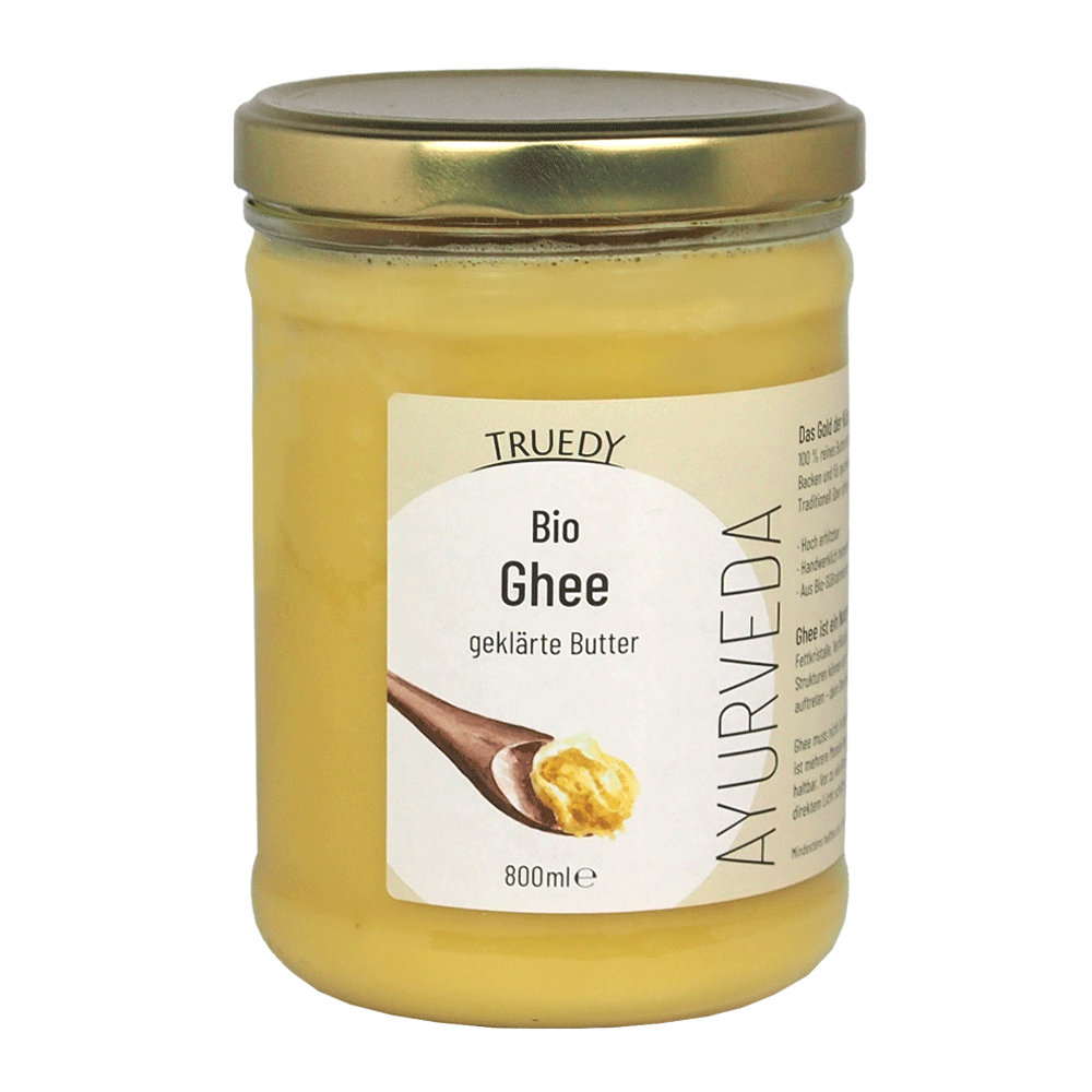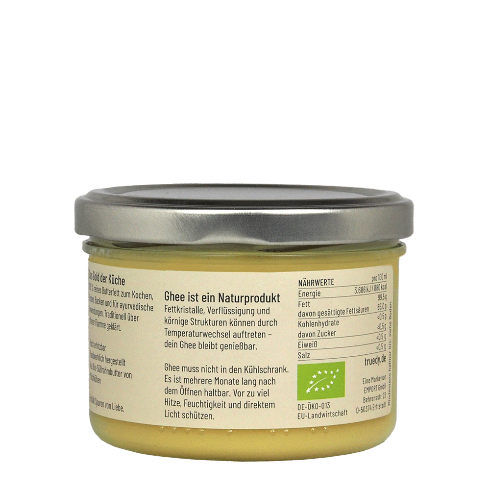 Truedy Bio Ghee: Das ist geklärte Butter (oder auch: Butterreinfett) aus ausgewählter Bio-Butter von Milchkühen. Doch nicht nur: Unsere handwerkliche Herstellung nach traditionell ayuvedischem Vorbild verleiht dem Ghee viele gute Eigenschaften und seinen besonders angenehmen Geschmack.