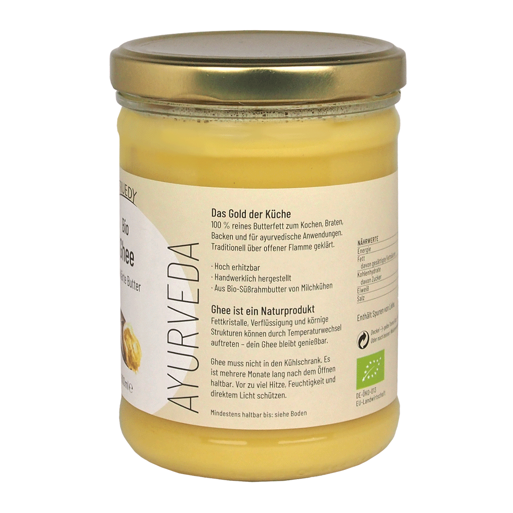 Hinweis: Ghee ist ein Naturprodukt. Bei (Raum-)Temperaturschwankungen, gerade im Sommer, kann es sich verflüssigen und wieder fest werden. Dabei entstehen manchmal Fettkristalle und die Struktur wird körnig. Das stellt keinen Qualitätsverlust dar und ist ganz typisch für Ghee.