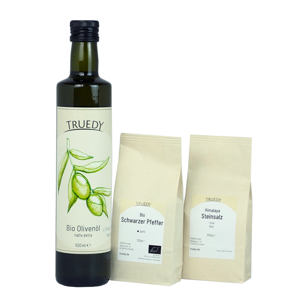 Beste Freunde – Bio Olivenöl, Steinsalz & schwarzer Pfeffer im Geschenk-Set