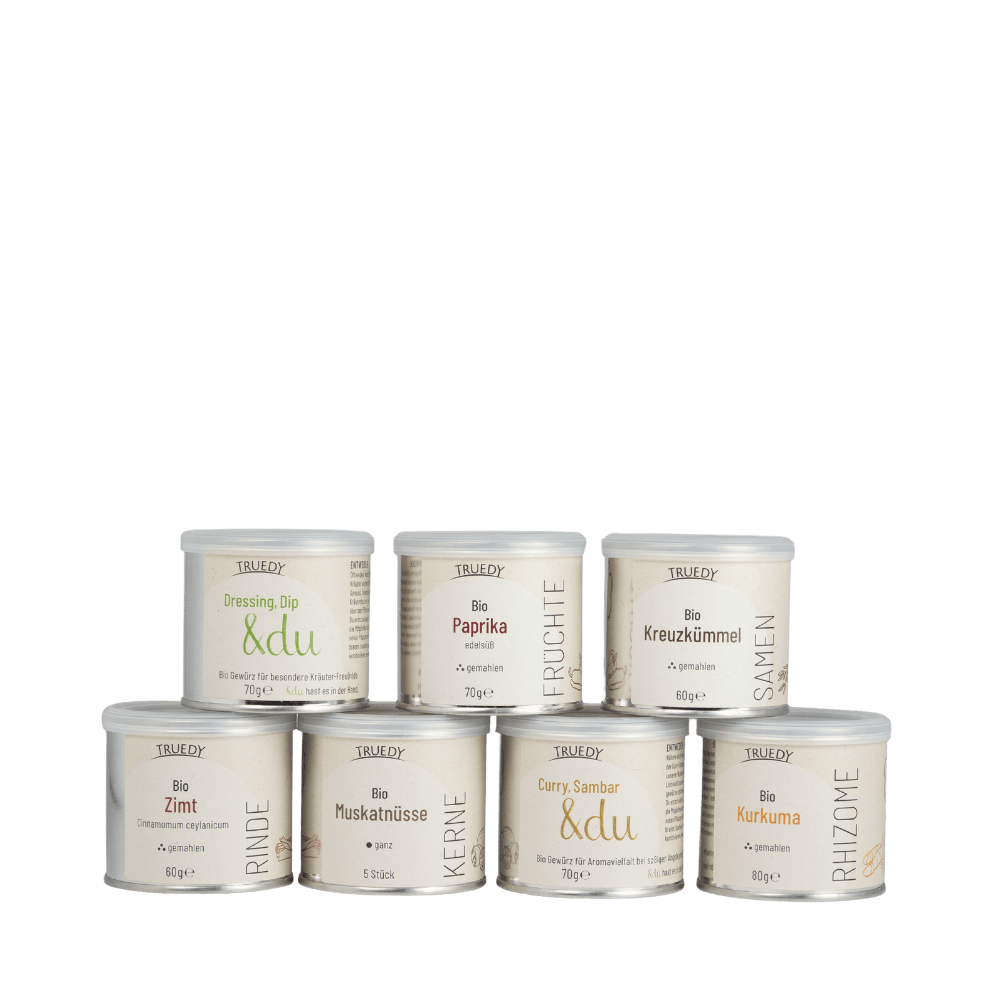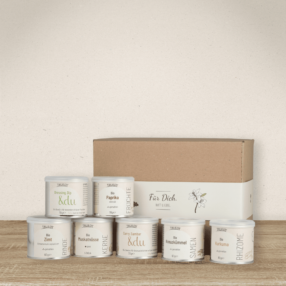 Die „Feinen Küchenlieblinge“ sind das ideale Set für alle, die gerne frisch, bewusst, vielseitig und gerne mal ohne Rezept kochen. Hier findest du Gewürze, die in keiner Küche fehlen dürfen: Muskatnuss, Paprika, Kreuzkümmel, Zimt und Kurkuma bilden eine aromatische Grundausstattung für Gemüsegerichte, Saucen, Dips, Dressings, Reisgerichte, Ofengemüse und internationale Klassiker. Dazu kommen zwei echte Alleskönner. Du schmeckst, dass Tradition auf Moderne trifft und. Sicherheit sich mit Kreativität verbindet: „Dressing, Dip &du“ – wenn es kräuterig, frisch und würzig sein soll. „Curry, Sambar &du“ – für kräftige, warme Gemüsegerichte voller Harmonie und Tiefe. Dieses Set ist die perfekte Mischung aus vertrauten Basics und besonderen Kompositionen – ideal für moderne Alltagsküche und kreative Genussmomente.